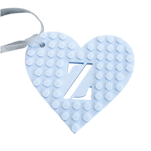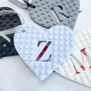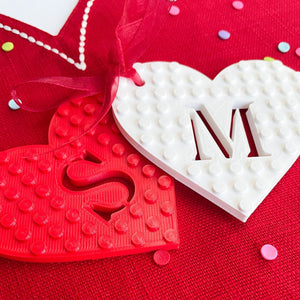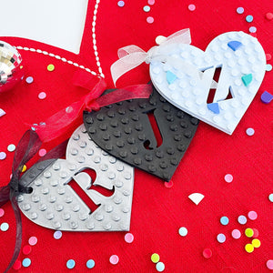 Personalised with your choice of initial cut out of the heart and Lego® compatible with the most to decorate further as desired.