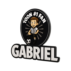 This personalised football wall sign is styled in bold black and white, making it a brilliant choice for football fans in Newcastle. Add any name to create a unique decoration that looks perfect on bedroom walls, shelves, or gaming setups.
