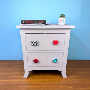 Each pack includes four knobs featuring whimsical tattoo-inspired designs, including heart, skull and crossbones, dove and red rose